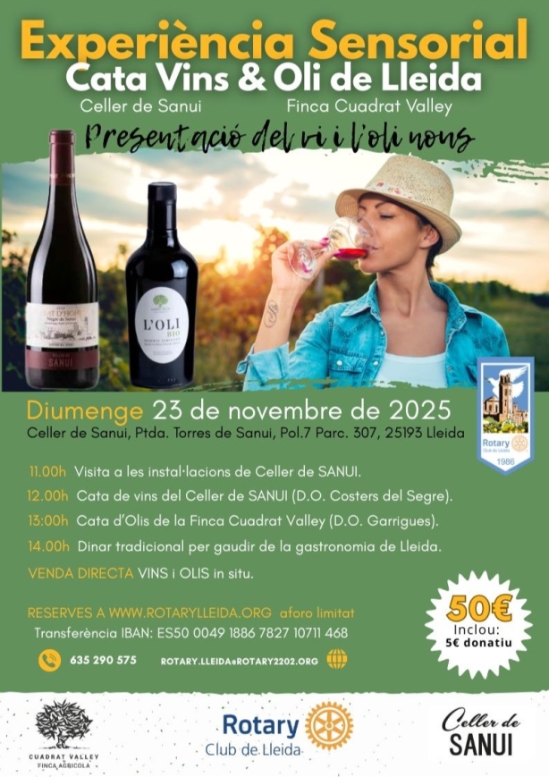 El Rotary Club de Lleida t'invita a una experiència sensorial única: visita al Celler de SANUI, cata dels seus vins (D.O. Costers del Segre) i cata d'olis de la Finca Cuadrat Valley (D.O. Garrigues). Aprèn, prova, degusta i emporta't producte directament del productor. Ideal per a amants de l'enogastronomia i per regalar (o regalar-te) un diumenge inoblidable.